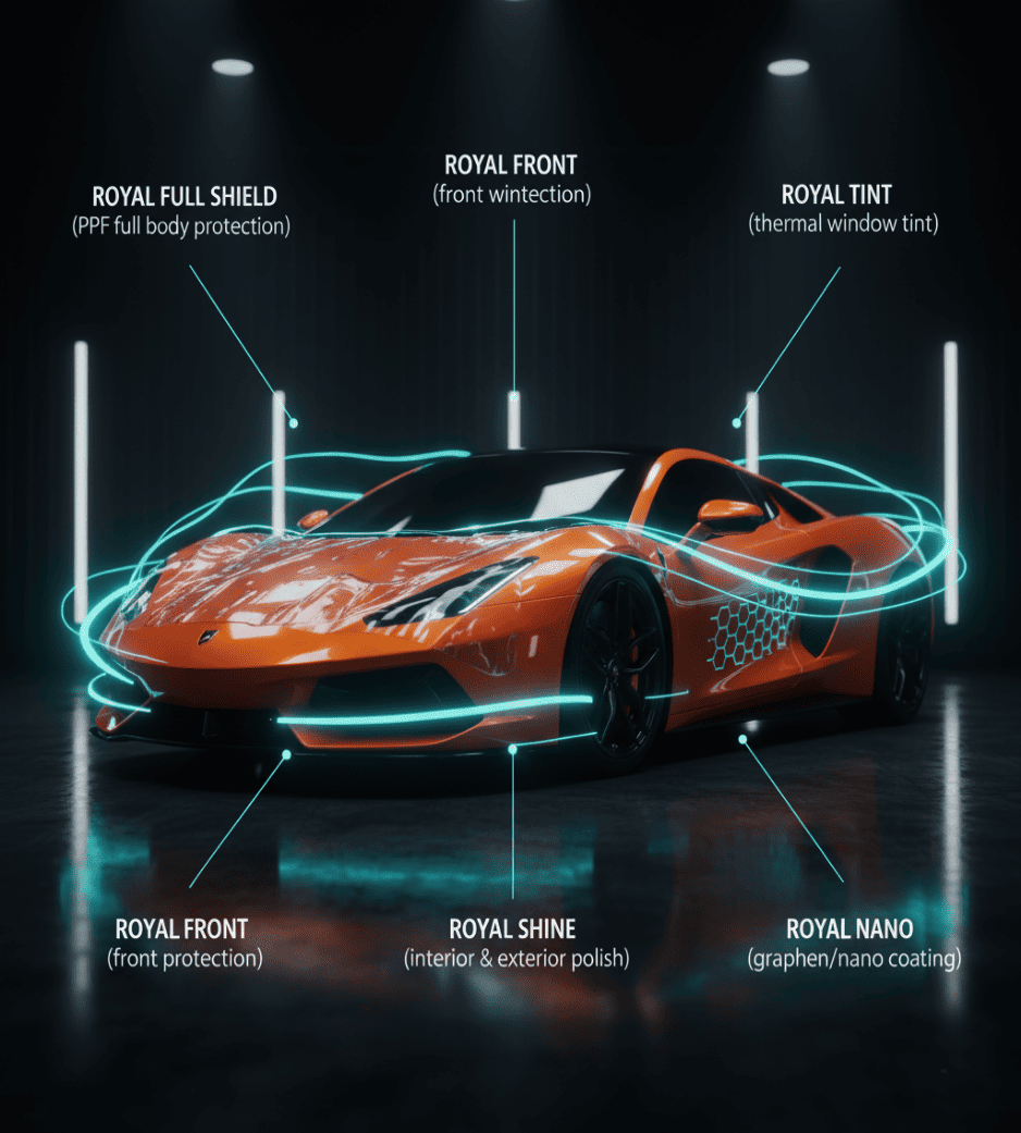 في رويال شيلد، نؤمن أن كل سيارة تستحق حماية تليق بها. لذلك قدّمنا مجموعة من الباقات المصممة بعناية لتلبي مختلف الاحتياجات وتمنحك راحة البال والأداء الذي تبحث عنه. اختر الباقة التي تناسبك واستمتع بتجربة حماية فريدة تجمع بين القوة، اللمعان، والأناقة.